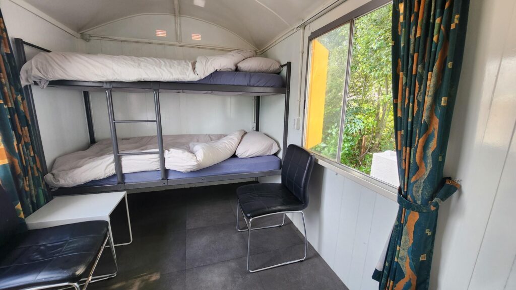 De douche en wc zijn gedeeld en bevinden zich in de kantine, vlak naast de Pipo-wagen.